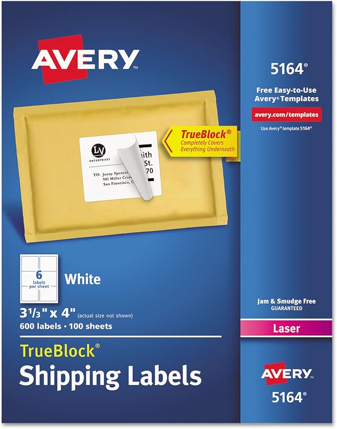 Avery Shipping Address Labels, Laser Printers, 600 Labels, 3-1/3x4 ... Arrives by Tue, Nov 9 Buy Avery Shipping Address Labels, Laser Printers, 600 Labels, 3-1/3x4 Labels, Permanent Adhesive, TrueBlock (5164), White at Walmart.com